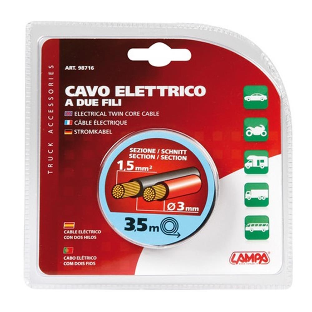 Electrical twin core cables - 1,5 mm² x 3,5 m. Section 1,5 mm² - Length 3,5 m - Exterior Ø 3 mm Universal for car, motorcycle, trucks.